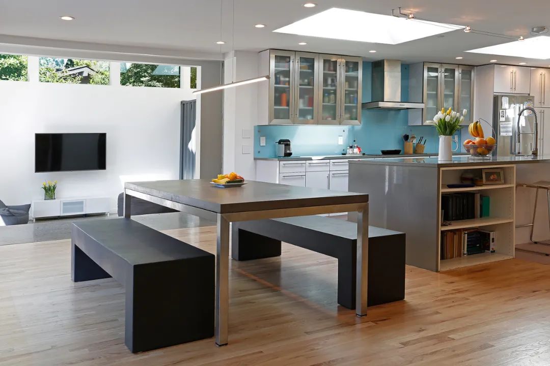 餐廳占用了很大一部分空間,開放式廚房的頂部采用了巨大的 LED燈,創造出室內的自然光照明效果,五米長的超大島臺內部隱藏著很多功能,電器、收納、吧臺、置物、多功能操作臺。