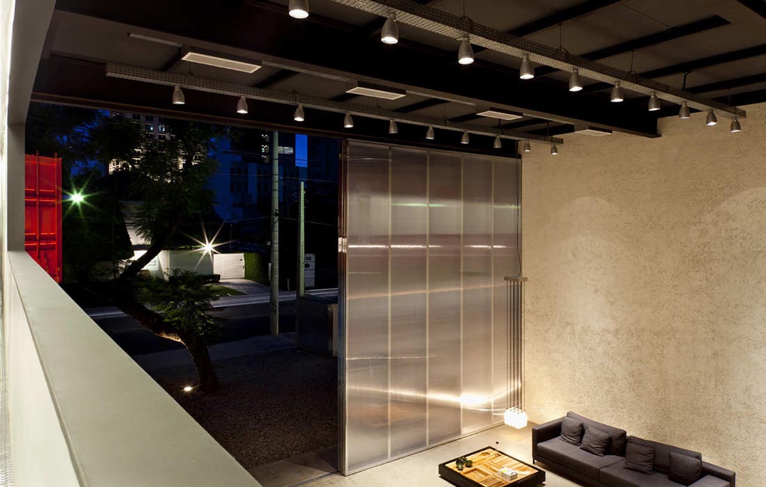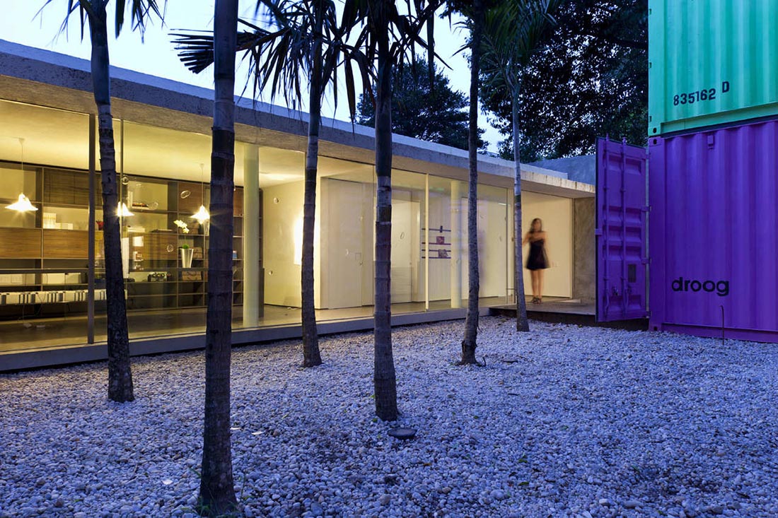 當時的想法是用廢棄的容器,重新組成一個現(xiàn)成的對象。該項目利用廢棄容器組織了兩條通道,同時其內(nèi)部空間發(fā)揮線性的優(yōu)勢,和一個雙層高度的體量依附于它,對比立方體體積。巨大的聚碳酸酯推拉門連接商店與城市的一個內(nèi)花園。