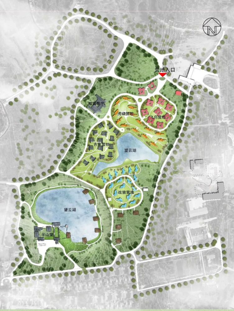 規(guī)劃設(shè)計(jì)也決定摒棄傳統(tǒng)規(guī)劃思維,探索新的規(guī)劃布局方式,將一個(gè)個(gè)獨(dú)立的“動(dòng)物”們按照它們喜好的群居組合,自由的空間布局組織,形成了熊貓餐吧,飛鳥(niǎo)營(yíng)地,吉象營(yíng)地,虎嘯營(yíng)地,戰(zhàn)狼營(yíng)地等幾個(gè)特色主題園區(qū)。將每個(gè)住宿單元根據(jù)自然景觀的分布,有序的散落在場(chǎng)地之中。并通過(guò)園區(qū)道路,將不同住宿單元分散開(kāi)來(lái),形成一個(gè)錯(cuò)落有序的分布。