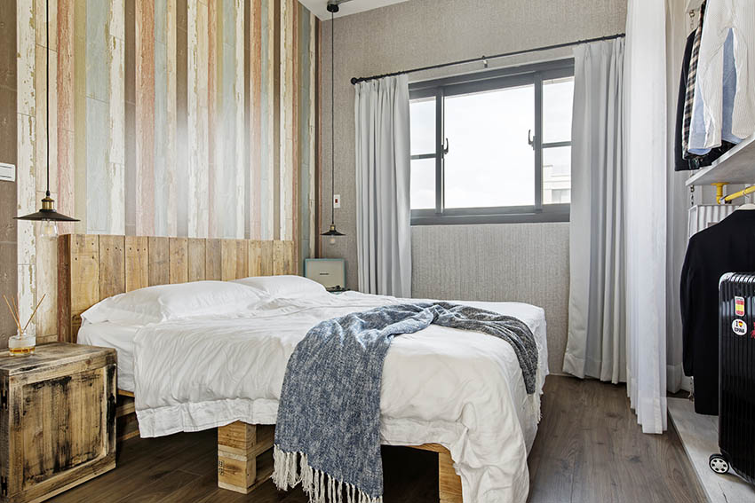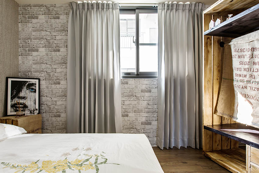 客房收納空間大,跟主臥室有著相同特點,并以棧板回收再利用組成儲物區(qū)域。另外,為修飾明顯梁柱,設計師運用灰磚壁紙達到轉移視覺效果。