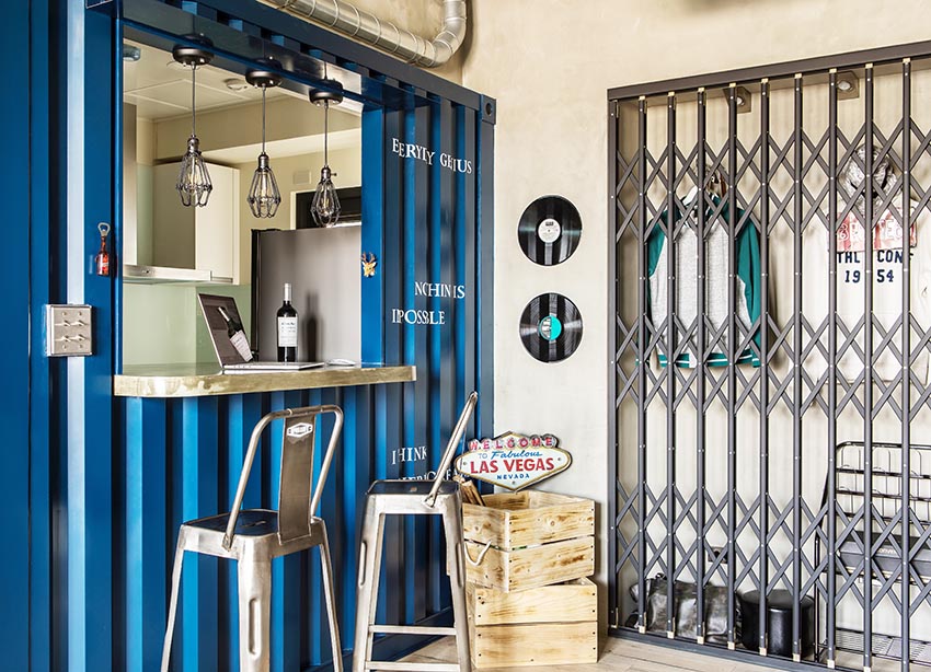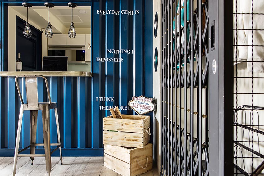 集裝箱作為空間的核心,考慮到搬運問題及重量,選擇以烤漆浪板當作表面,輔以木作增強整體效果;以造型工作燈點綴,加上兩把純真年代單椅,輕巧帶出 Loft 風隨性感。