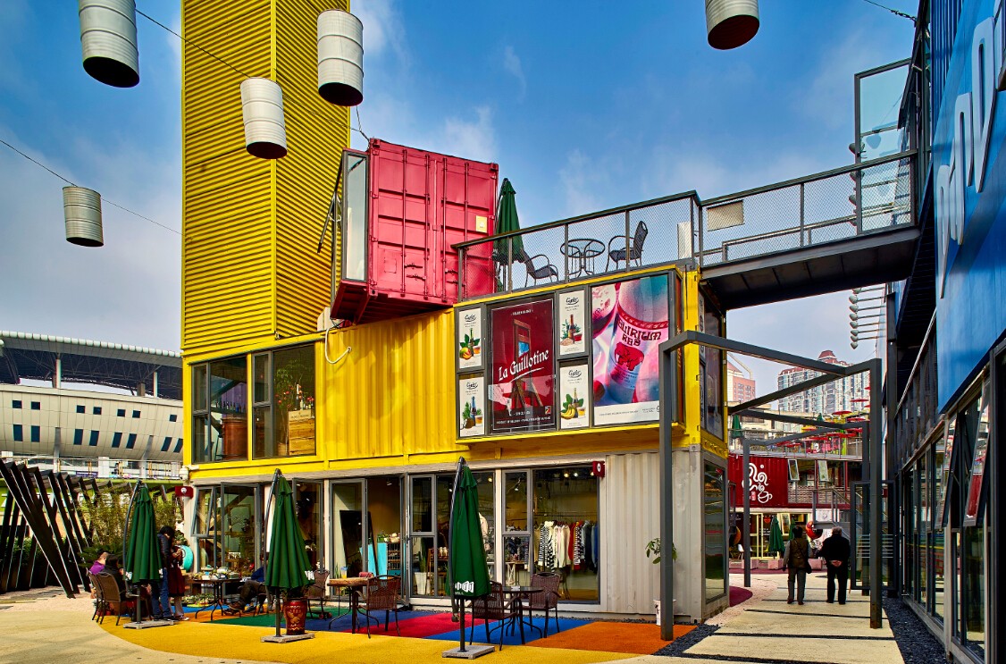 顏色絢麗,個性十足的涂鴉及獨特商業形象吸引了人們的眼球。27個特色的集裝箱交錯堆疊組合展現于眼前,形成了別具一格的商業空間