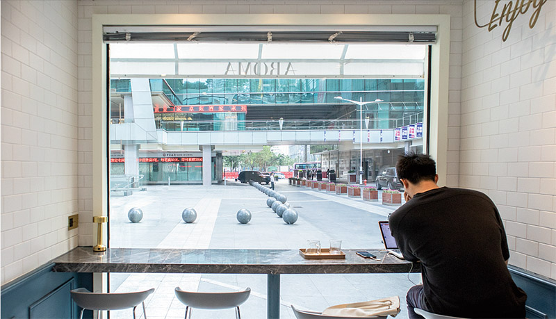 Aroma Coffee 藏在福田 CBD 的一群高樓大廈底下,低飽和度的霧靄灰藍色集裝箱外形在深圳來說,還是有一分與眾不同,開業不久就已成為附近白領的每日打卡點。